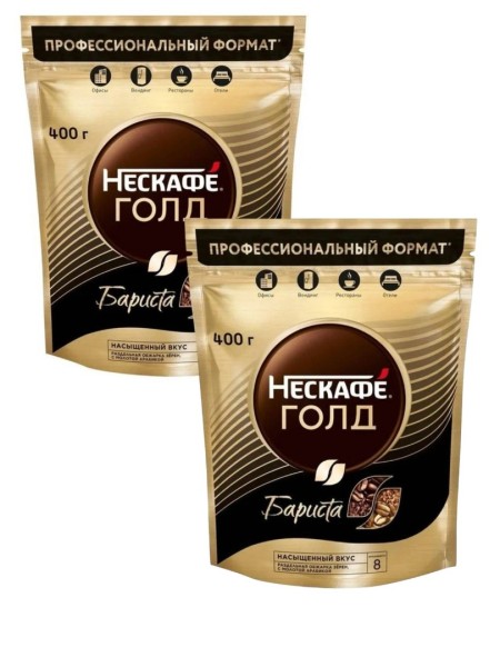 Кофе Нескафе Голд Бариста молотый в растворимом, 400 г пакет. 100% натуральный растворимый сублимированный кофе с добавлением натурального жареного молотого кофе. Состав: натуральный растворимый сублимированный кофе, натуральный жареный молотый кофе.