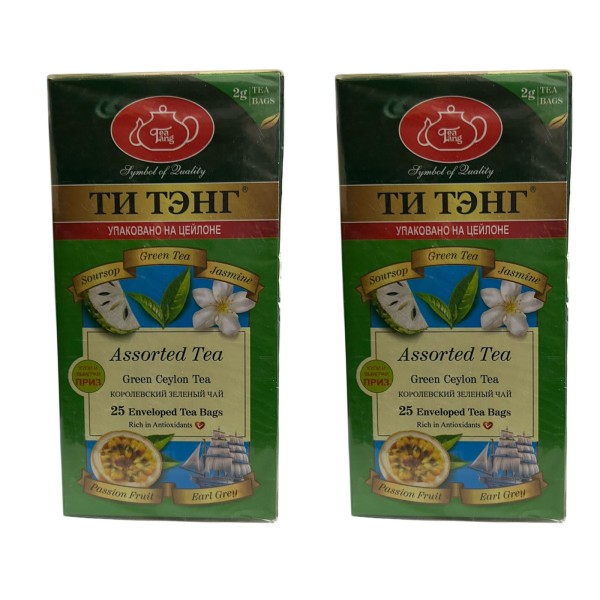 Набор из пяти сортов цейлонского чая на основе зеленого чая и разных фруктовых добавок. В наборе 25 пакетов, каждый из которых запаян в индивидуальный конверт, что не дает чаю терять свой аромат, терпкость и насыщенный вкус, а так же препятствует смешиванию разных ароматов и попаданию посторонних. Во фруктовое ассорти входит классический цейлонский Green Tea, Earl Gray и чаи с ароматами маракуйи, жасмина и гравиолы. Вес одного пакета 2.5 грамма. Чай получается крепкий и насыщенный, а высокая концентрация эфирных масел дает ярко выраженный аромат. Данный набор может стать отличным подарком для любителей зеленого чая и фруктовых вкусов